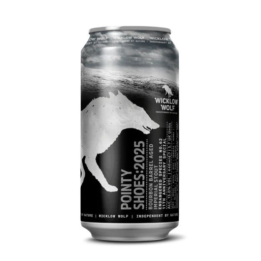 Introducing Endangered Species no.62, Pointy Shoes 2025. First released in 2019 to mark Wicklow Wolf's 5th Birthday. Pointy Shoes 2025, a Bourbon Barrel Aged Imperial Stout aged in Bourbon barrels for 12 months, was brewed to celebrate their 11th birthday. Expect smooth bourbon notes of oak vanilla,complimented with coffee and chocolate from the malt bill.